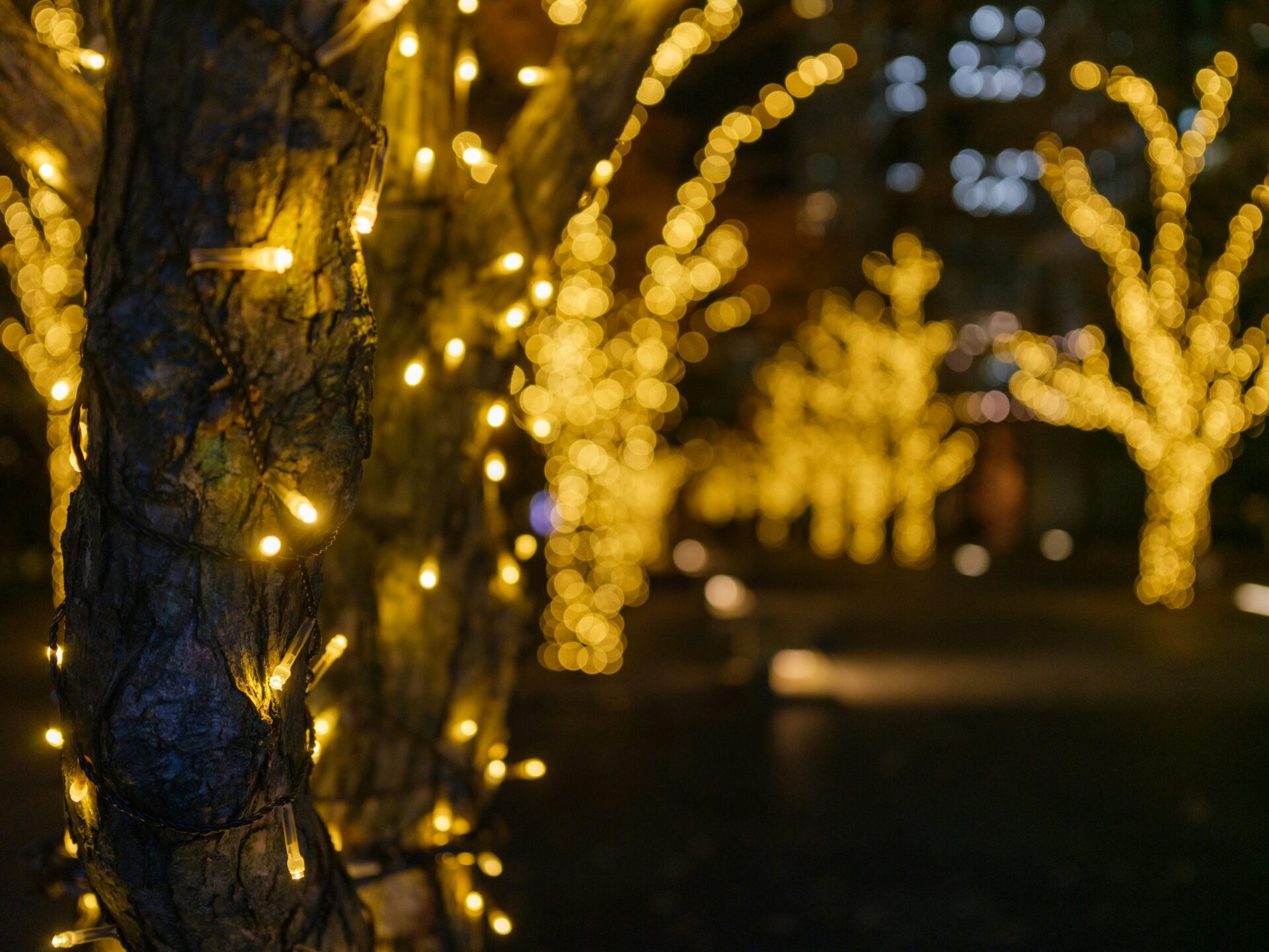 イルミネーション散策開始。約1.2kmの光のトンネルを歩きながら、「このツリー、毎年違うんだよ」と彼女が話す。